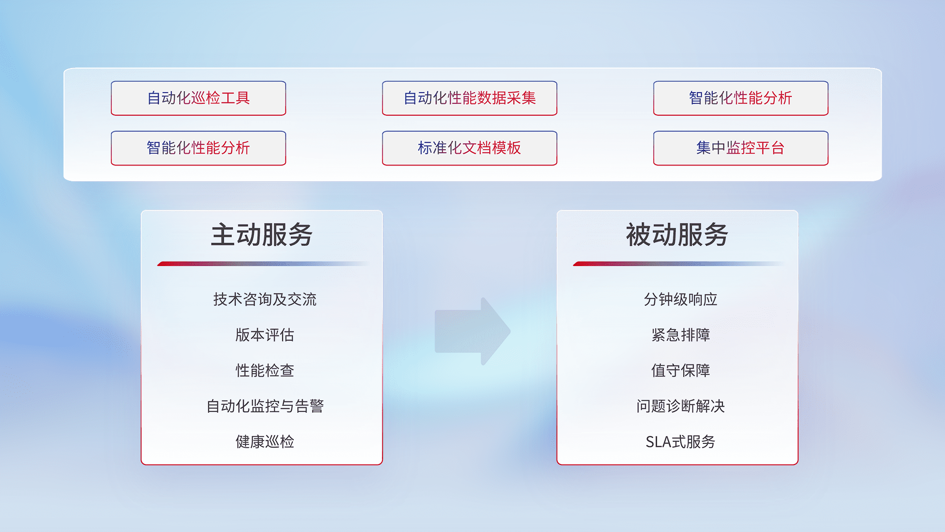 智能化工具和标准化文档,,,保障服务质量,,提供主动服务(包含技术咨询、、、、版本评估、、、性能检查、、自动化监控与告警、、、、健康巡检)和被动服务包含(分钟级响应、、紧急排障、、、值守保障、、问题诊断解决、、SLA服务)。。。。