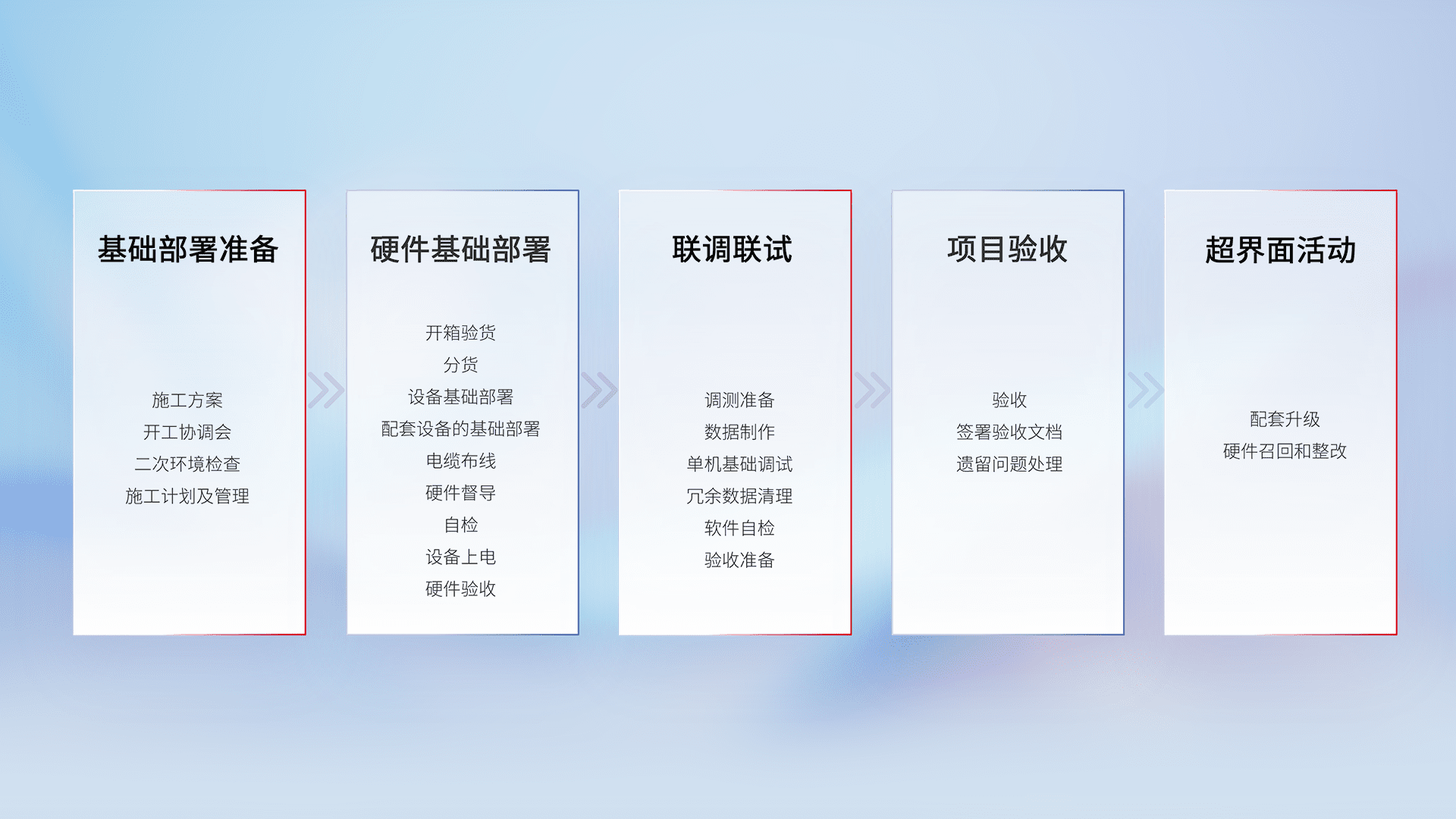 从基础部署准备、、、硬件基础部署、、、联调联试、、、、项目验收、、越界面活动的全过程可追溯,,,保证施工质量和进度。。